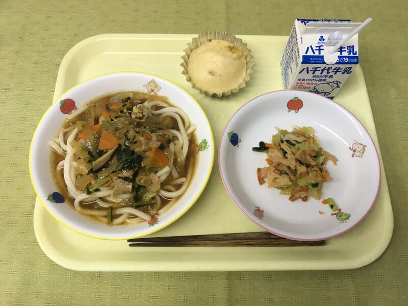献立:牛乳 うどんかいじんのカレーうどん れんこんサラダ さつまいも蒸しパン