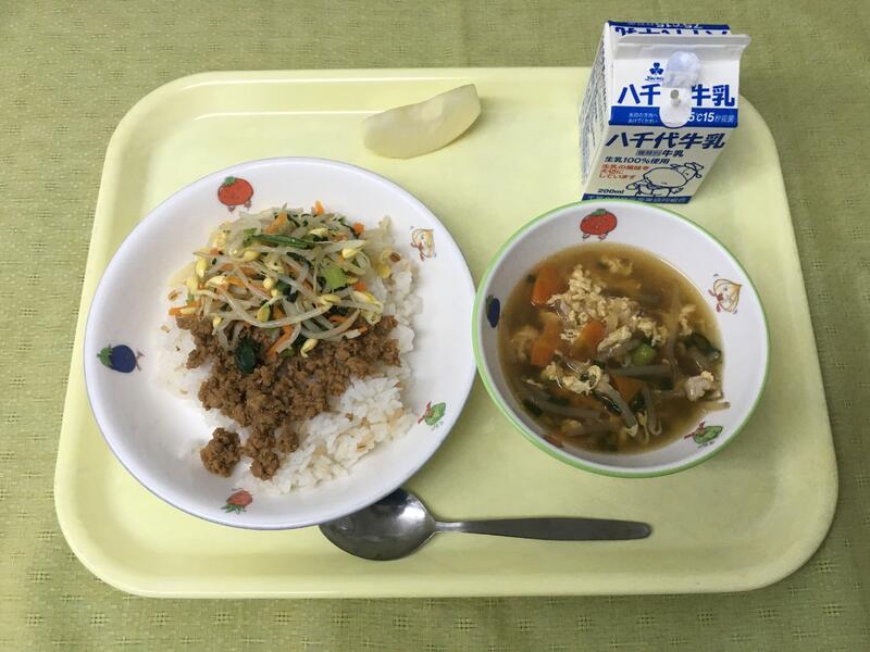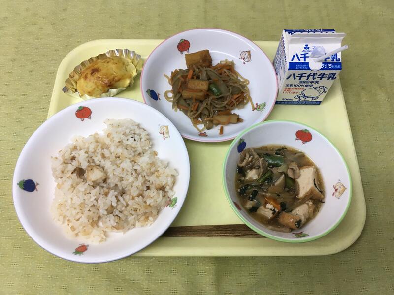献立:牛乳 ごはん 卵焼き ひじきと大豆の磯煮 生揚げのそぼろ煮