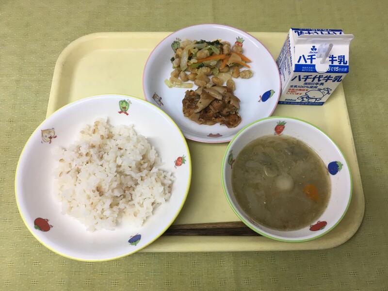 献立:牛乳 ごはん 鶏肉のケチャップ麴焼き カリカリ大豆サラダ 胡麻味噌汁