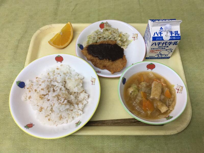 献立:牛乳 ごはん 味噌カツ(愛知県) コールスローサラダ 白菜の味噌汁 オレンジ