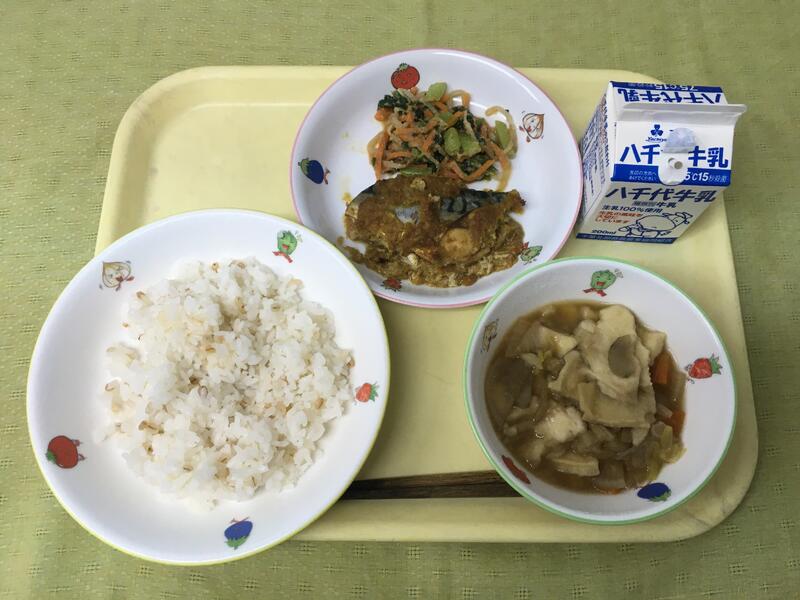 献立:牛乳 ごはん 鯖のカレー焼き 小松菜の胡麻醬油和え せんべい汁(青森県)