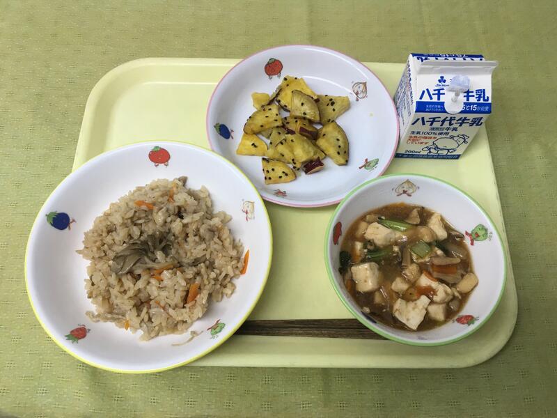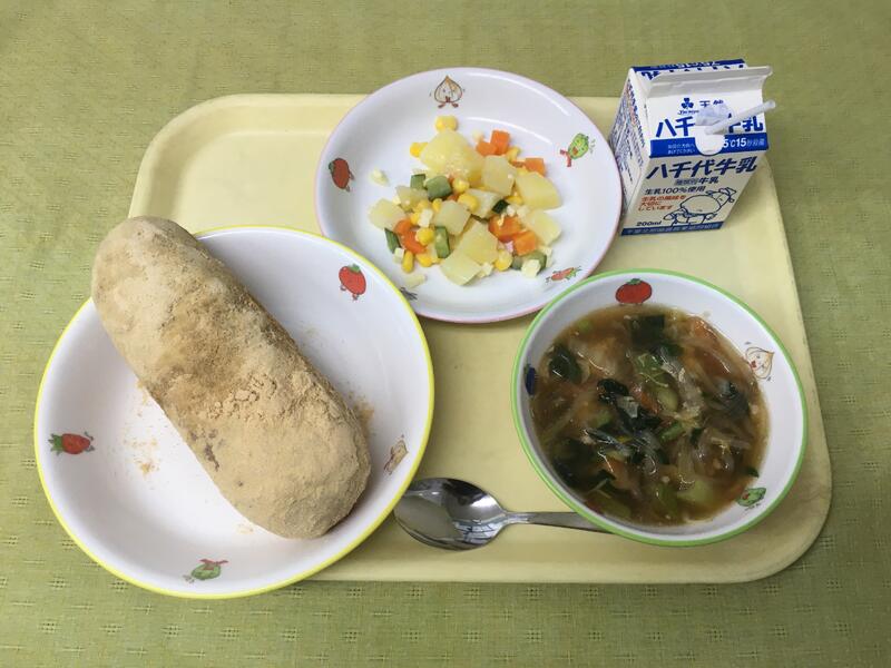 献立:牛乳 さつまいもごはん ひじきと大豆の磯煮 豆乳豚汁 きなこ団子