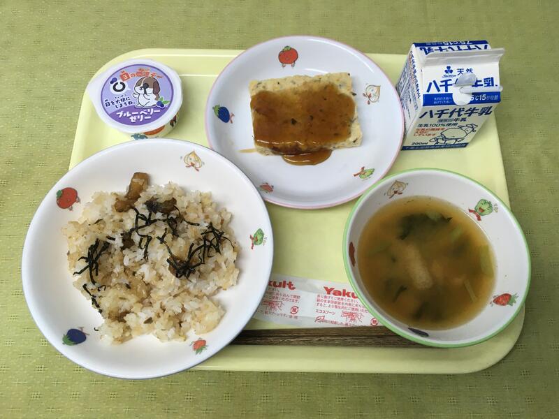 献立:牛乳 秋刀魚ごはん 擬製豆腐 小松菜の味噌汁 ブルーベリーゼリー
