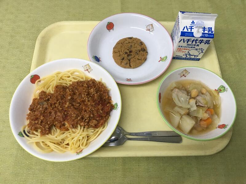 献立:牛乳 スパゲッティ・茄子のミートソース ポトフ 生プルーン
