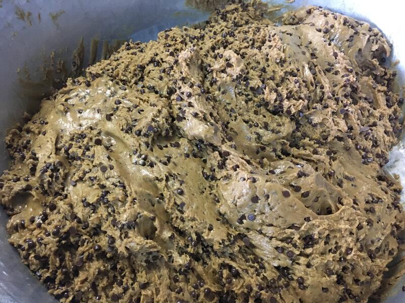 絵本の中では昆布とキャラメルで作られたものでしたが、給食ではココア生地のクッキーをプレーン生地のクッキーで包んで伸ばしました。