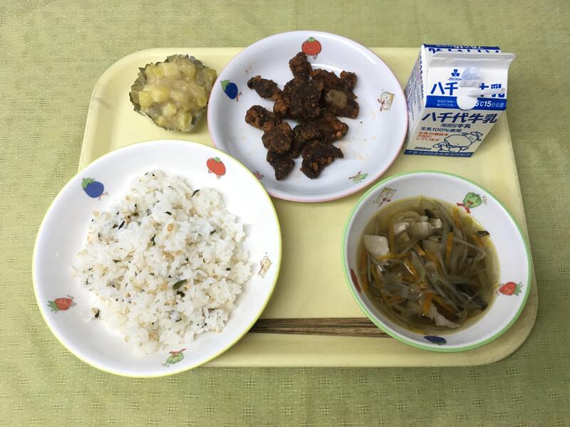 献立:牛乳 ごはん 万鯛の竜田揚げ ほうれん草の菊花和え 鶏じゃが