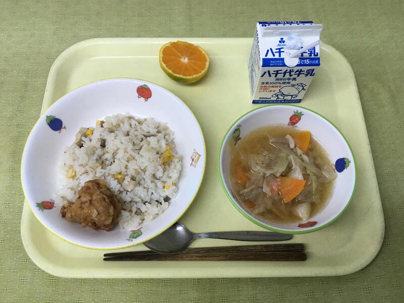 献立:牛乳 ごはん 行徳産海苔の佃煮 千葉県産ハーブ鶏の竜田揚げ 小松菜のおひたし 千産千消豚汁