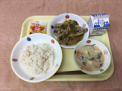 献立:牛乳 ごはん 鰯のみぞれ餡かけ 呉汁 福豆
