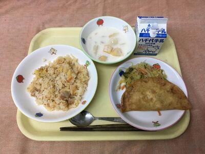 献立:牛乳 キムタクごはん 揚げ餃子 春雨サラダ フルーツヨーグルト