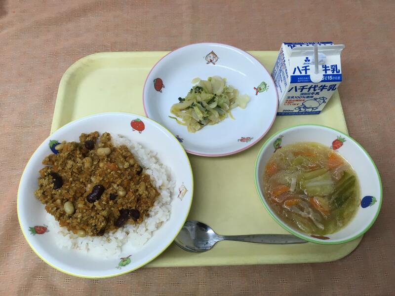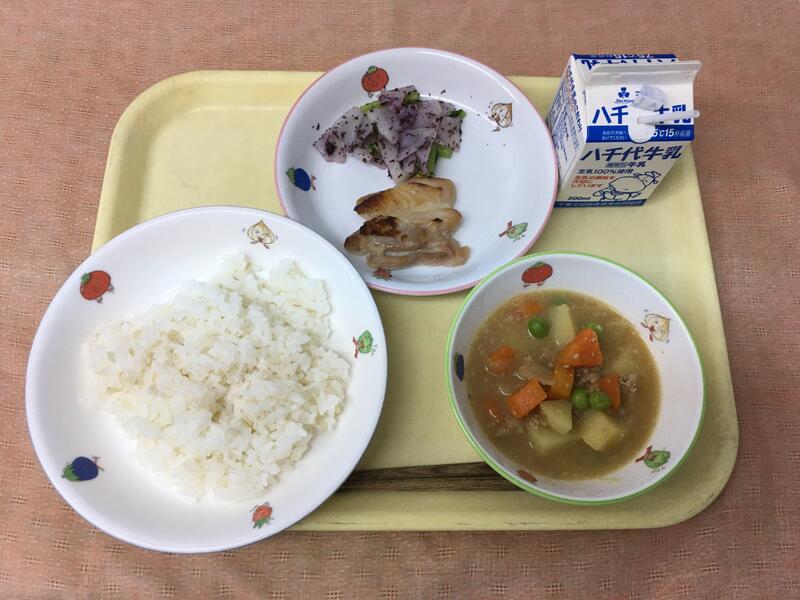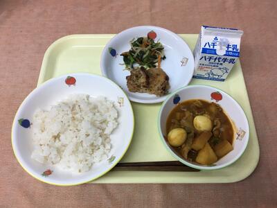 献立:牛乳 ごはん 鶏肉のハニーマスタード焼き 小松菜のおひたし インド煮