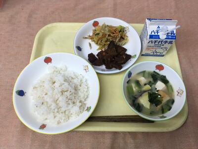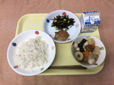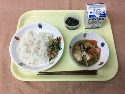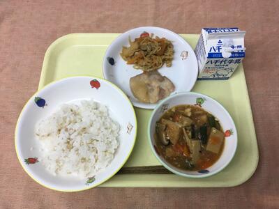 献立:牛乳 ごはん 鶏肉の塩麹焼き 切り干し大根の含め煮 家常豆腐