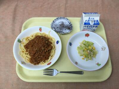 献立:牛乳 スパゲッティ・ミートソース コールスローサラダ ガトーショコラ