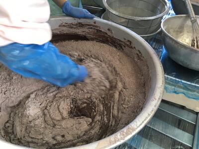 今日はバレンタインに因んで、手作りのガトーショコラにしました。ガトーショコラはココアパウダーと薄力粉をふるい、バターなどと合わせて焼きました。気温が少し暖かい日でしたが、調理場の気温は低く、バターが固まってしまうため混ぜるのが大変な中作ってくれました。
