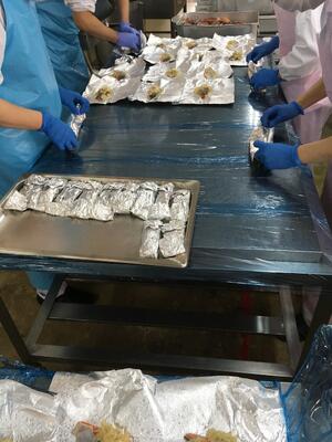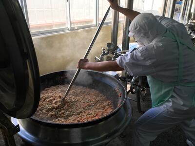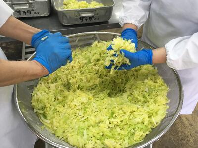 ミートソースは玉ねぎから水分が多く出たので、調理員さんが1時間近くミートソースが跳ねる中煮詰めてくれました。おかげさまで、トマトの酸味も柔らかくなり、味も薄くならないミートソースを作ってくれました。