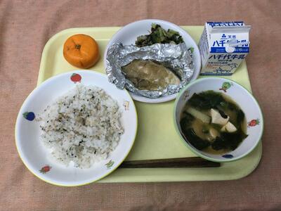 献立:牛乳 わかめごはん 鮭のホイル焼き 磯香和え ほうれん草の味噌汁 みかん