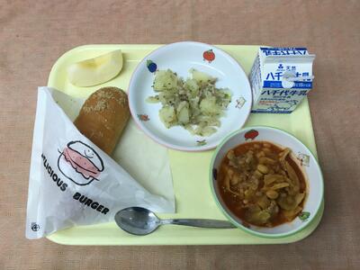 献立:牛乳 ごま揚げパン ジャーマンポテト もち麦のミネストローネ りんご