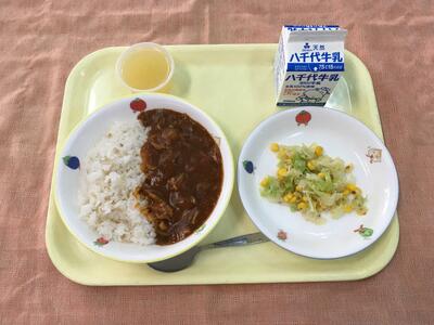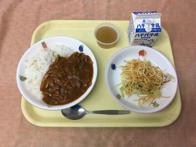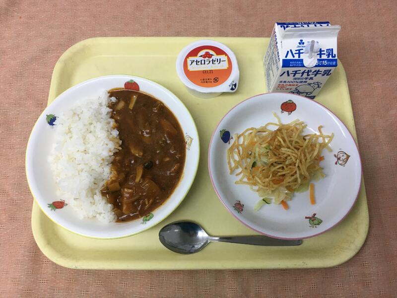 献立:牛乳 ハヤシライス じゃがいものハニーサラダ アセロラゼリー