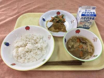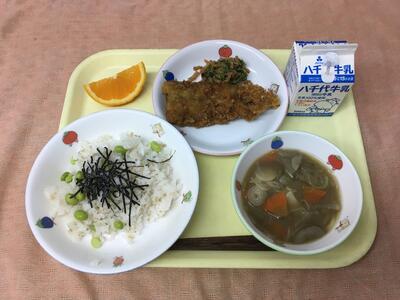 献立:牛乳 枝豆ごはん 鰯のフライ・カレー風味 ほうれん草の胡麻和え 根菜の味噌汁 オレンジ