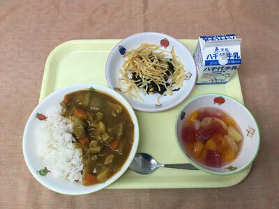 献立:牛乳 ごはん ポークカレー ごぼうサラダ フルーツポンチ