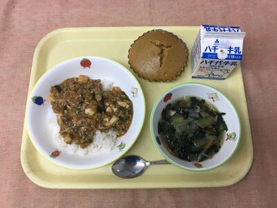 献立:牛乳 麻婆豆腐丼 中華スープ 黒糖蒸しパン
