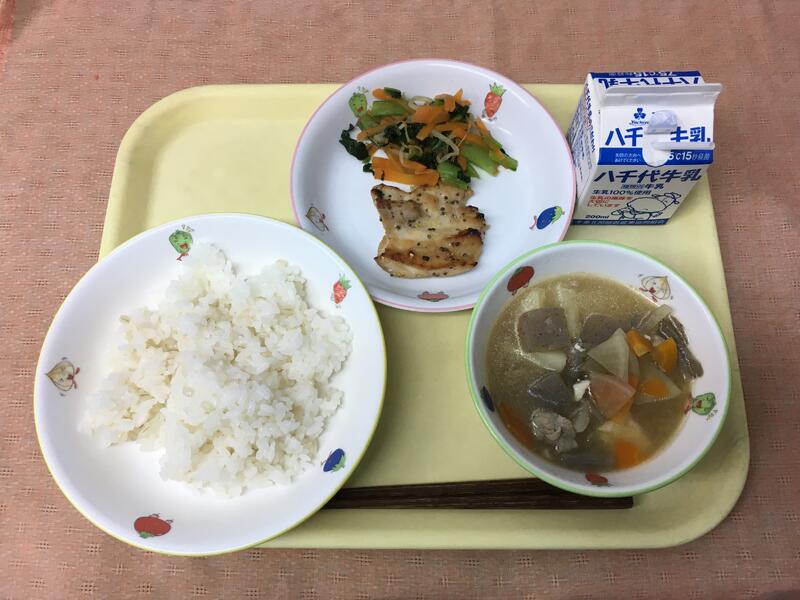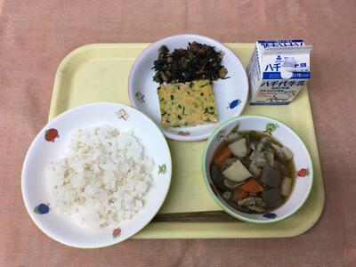 献立:牛乳 ごはん 卵焼き ひじきと大豆の磯煮 芋煮(山形県)