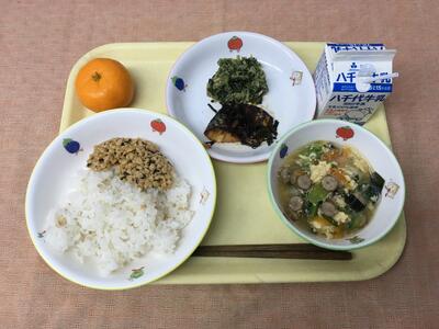 献立:牛乳 納豆と海苔のごはん 焼き鯖のポン酢がけ ほうれん草とキノコの胡麻和え あったか春雨スープ みかん