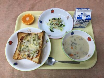 献立:牛乳 ピザトースト シーザーサラダ 豆乳クラムチャウダー みかん
