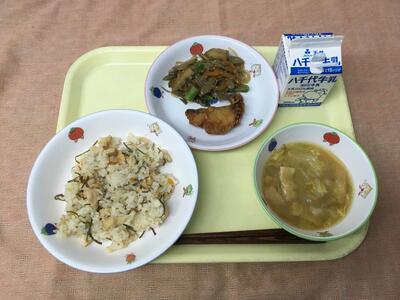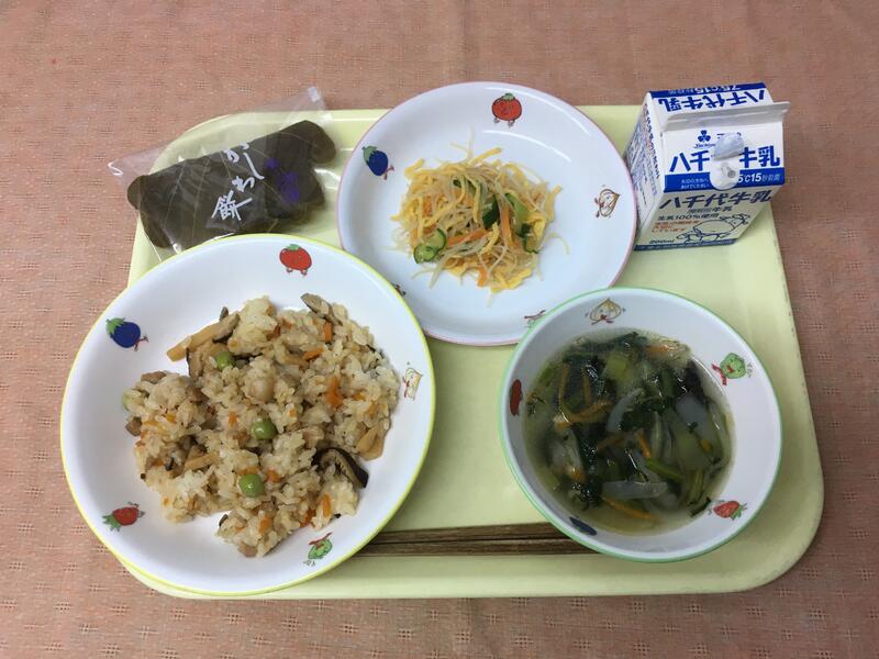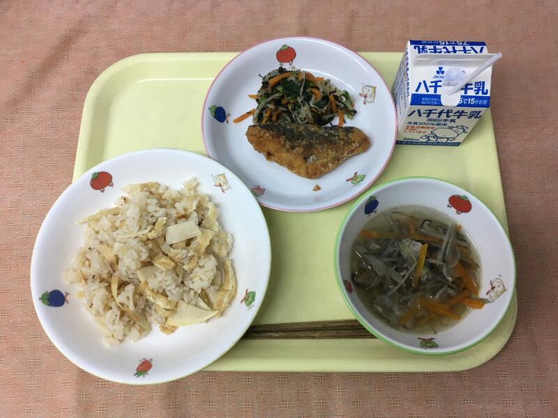 献立:牛乳 たけのこご飯 鯖の竜田揚げ 小松菜の海苔おかか和え 沢煮椀