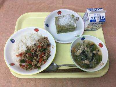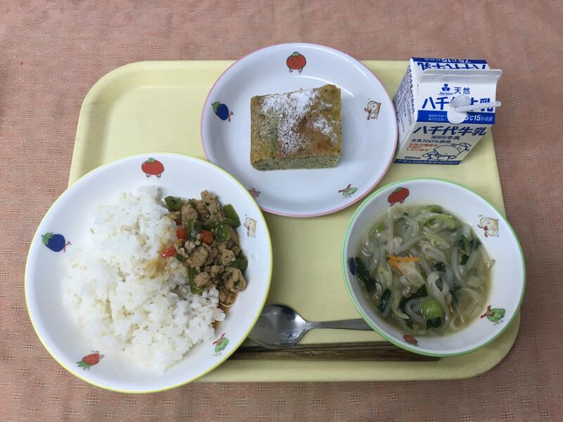 献立:牛乳 ガパオライス 和風フォー ほうれん草とバナナのケーキ