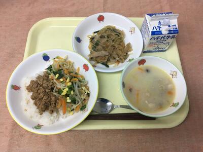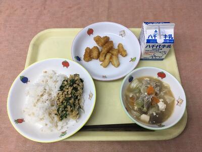 献立:牛乳 ごはん タラの甘酢ソースがけ 菜花とキャベツのおひたし 生揚げのそぼろ煮