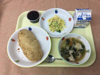 献立:牛乳 きなこ揚げパン マカロニのカレーサラダ 肉団子スープ ぶどうゼリー