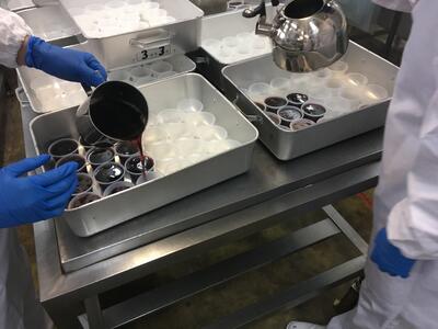 全校分のゼリーカップ1つ1つにゼリー液を入れて冷やします。