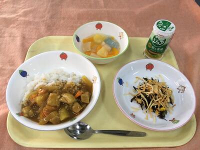 献立:牛乳 ポークカレー パリパリひじきサラダ フルーツパンチ ジョア