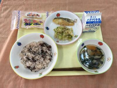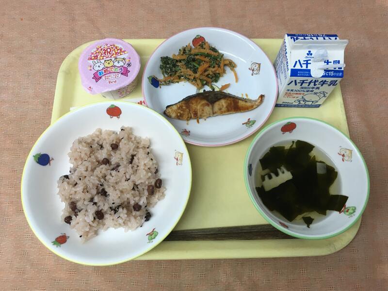 献立:牛乳 赤飯 ぶりの照り焼き ほうれん草の胡麻和え 若竹汁 おいわいいちごゼリー