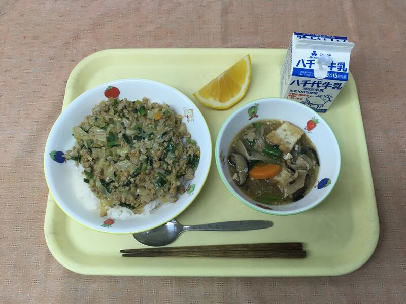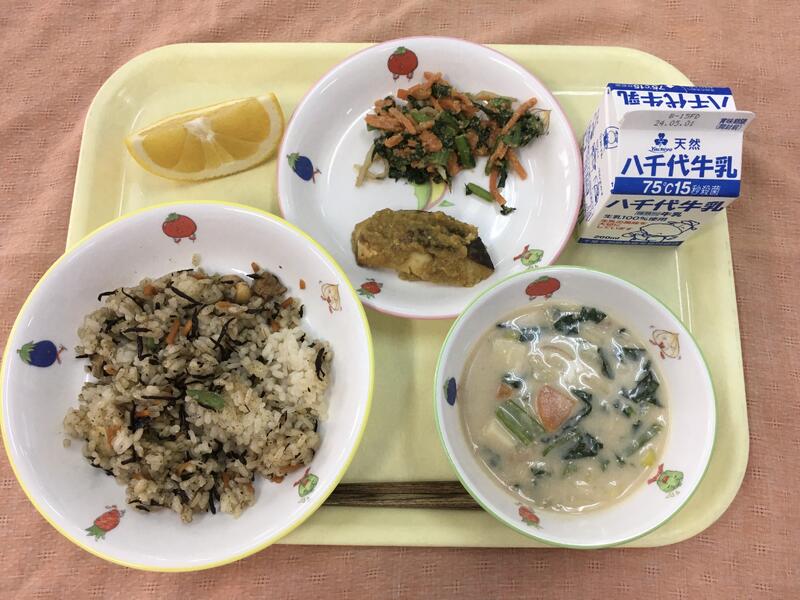 献立:牛乳 ひじきごはん 鯖のカレー焼き 小松菜の胡麻醤油和え 呉汁 河内晩柑