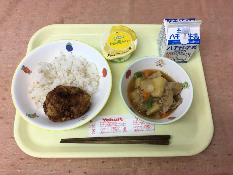献立:牛乳 ごはん 春キャベツのメンチかつ 肉じゃが 日向夏ゼリー
