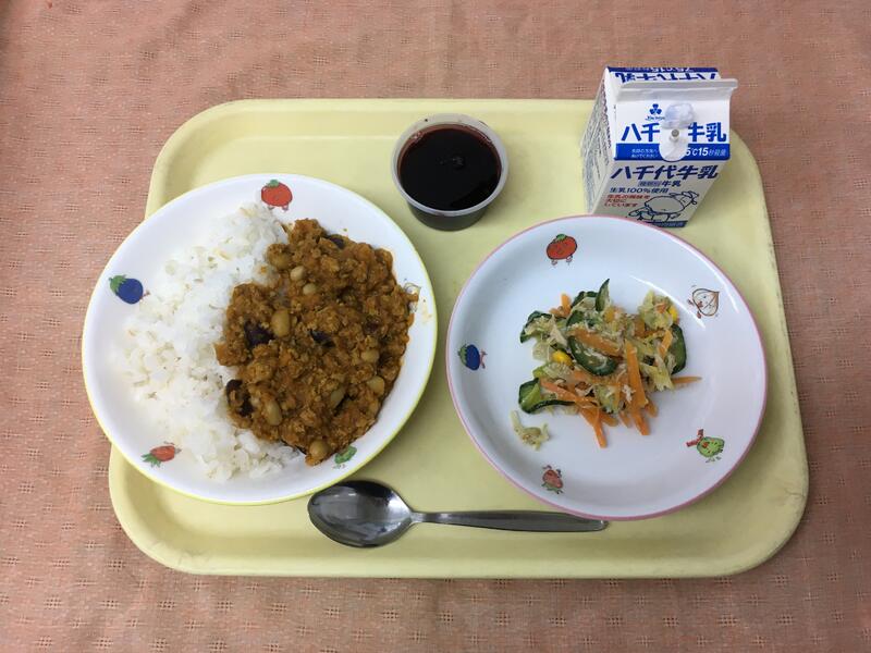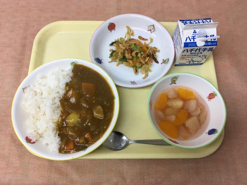 今日はリクエスト給食で1位のカレーと2位のフルーツポンチという組み合わせの献立です。