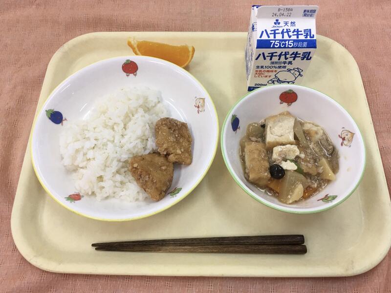 献立:牛乳 ごはん 万鯛の竜田揚げ 生揚げのそぼろ煮 デコポン 牛乳