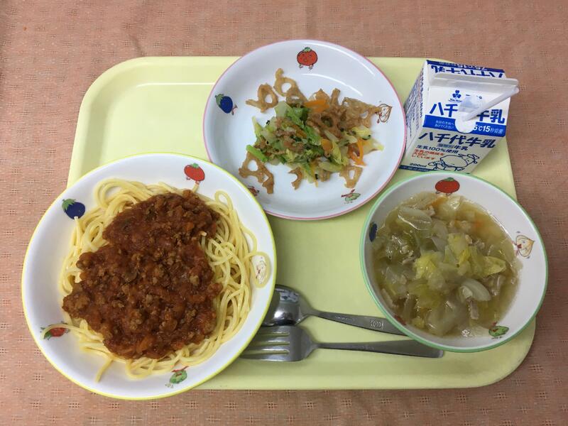 献立:牛乳 スパゲッティ・ミートソース れんこんサラダ コンソメスープ
