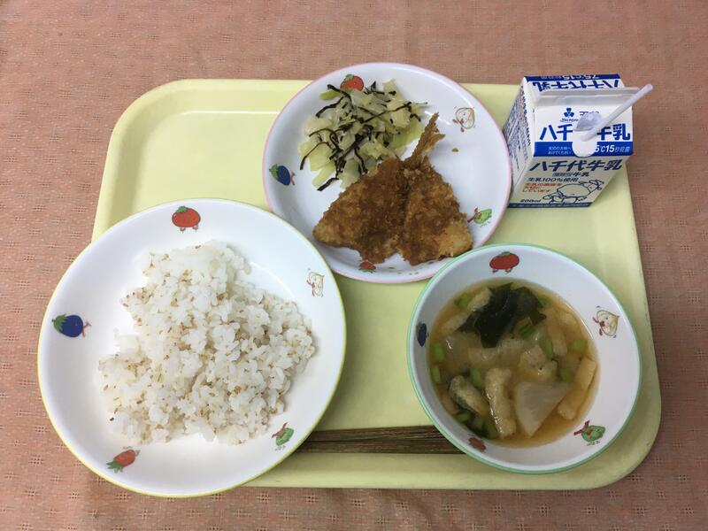 献立:牛乳 胡麻ごはん アジフライ キャベツの塩昆布和え 蕪の味噌汁