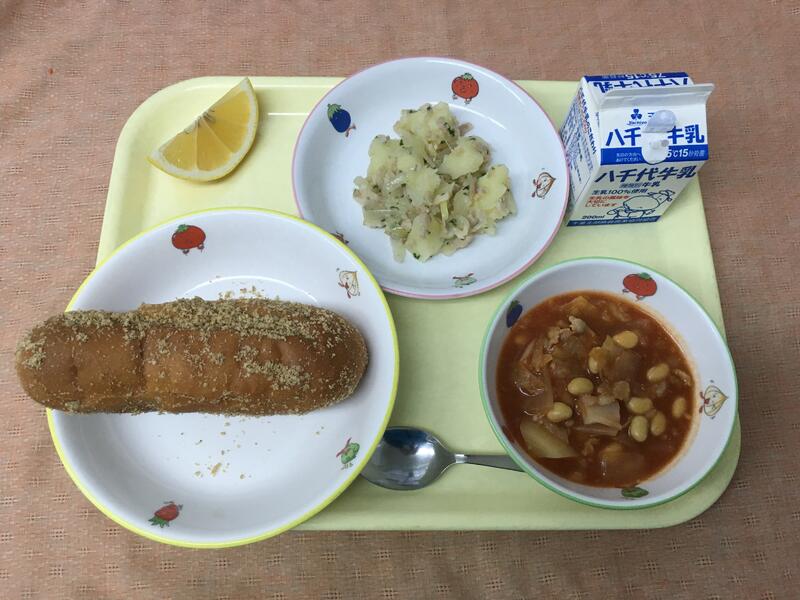 献立:牛乳 ごま揚げパン ジャーマンポテト もち麦のミネストローネ 小夏
