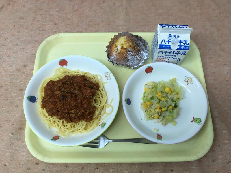 献立:牛乳 スパゲッティ・ミートソース コールスローサラダ マドレーヌ
