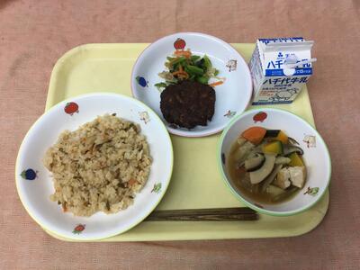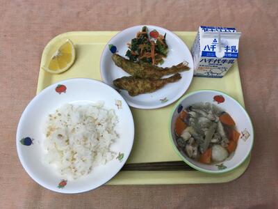 献立:牛乳 とりめし 飫肥天(宮崎県郷土料理) 小松菜のおひたし ざぶ汁(宮崎県郷土料理)