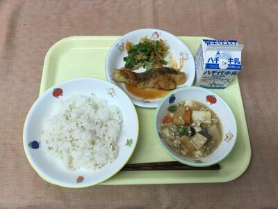 献立:牛乳 ごはん タラの甘酢ソースがけ 菜花とキャベツのおひたし 生揚げのそぼろ煮