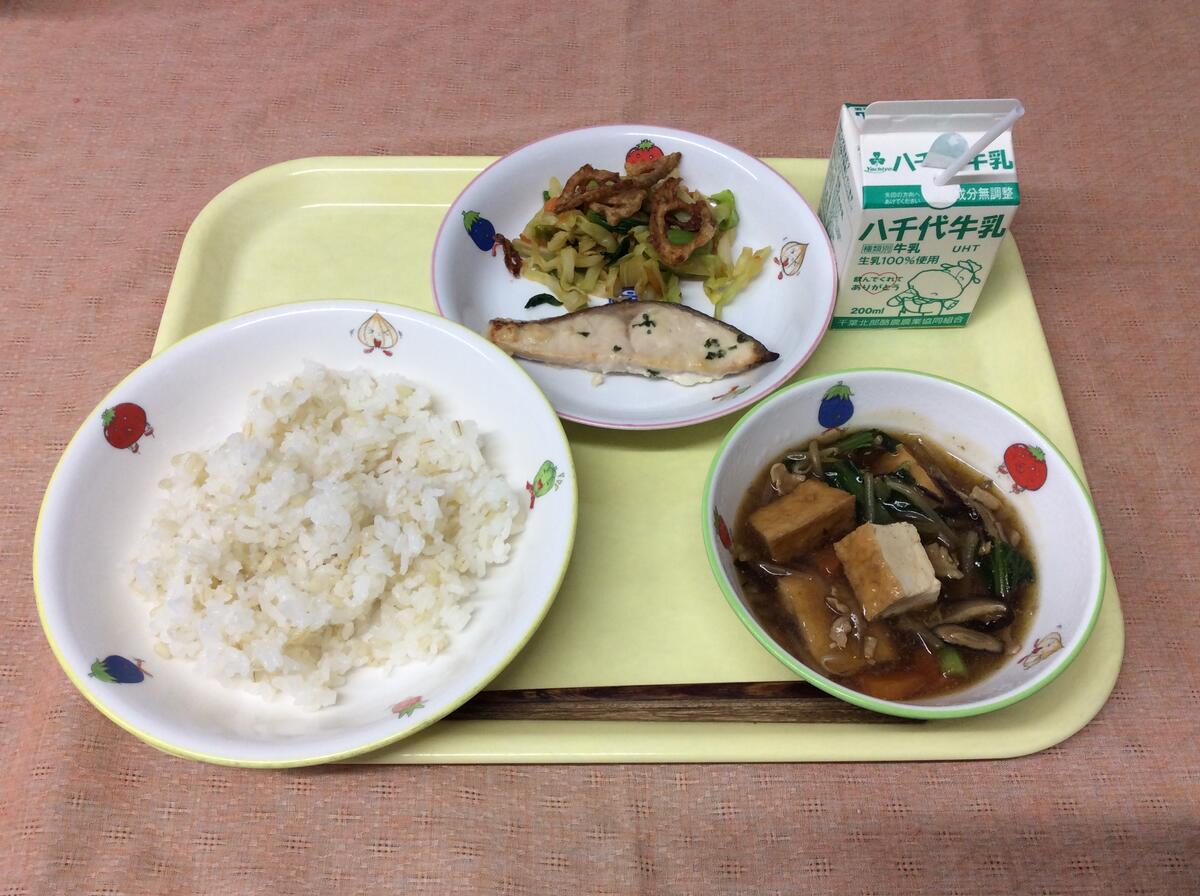 献立:牛乳 ごはん 鮭の味噌マヨネーズ焼き 蓮根サラダ 生揚げと野菜の旨煮