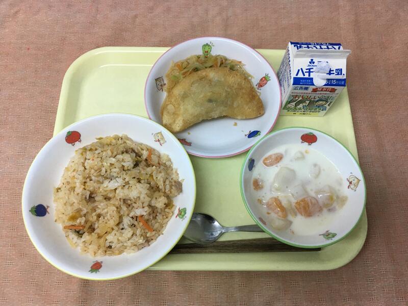 献立:キムタクごはん 揚げ餃子 春雨サラダ フルーツヨーグルト