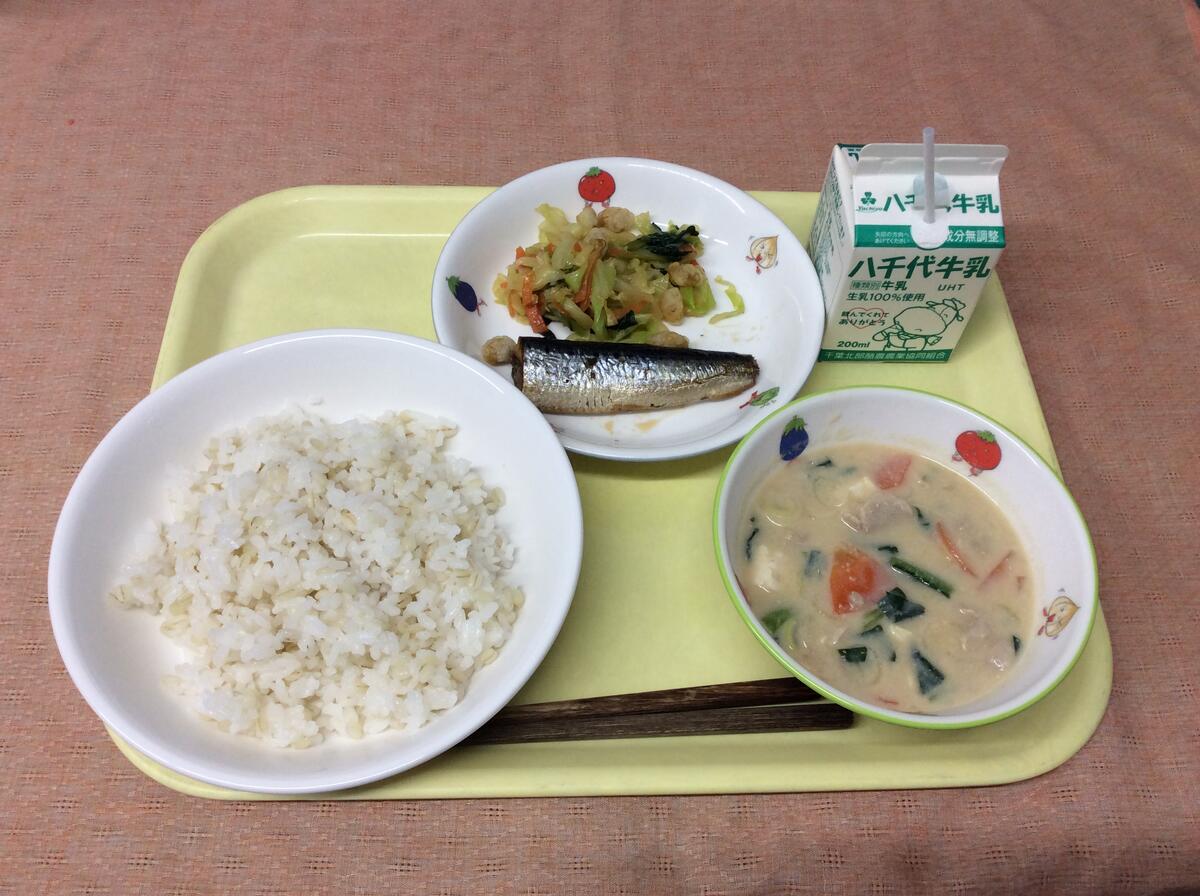 献立:牛乳 ごはん 鰯の生姜煮 カリカリ大豆サラダ 呉汁