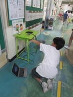 6年生が家庭科で学校のクリーン大作戦に取り組んでいます。自分たちで校内の掃除をしたいところを探し、タブレッ