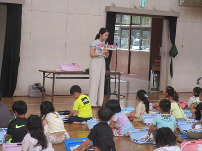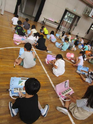 1年生が鍵盤ハーモニカの講習会を行いました。指の使い方、息の吹き方など基本的なことを丁寧に教えていただきまし