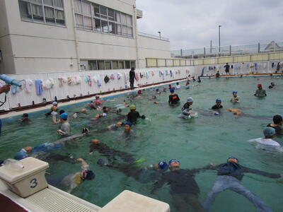 みました。指導員5名で来ていただいたので水の中で苦労している子に教えていただき、だんだん皆できるようになり